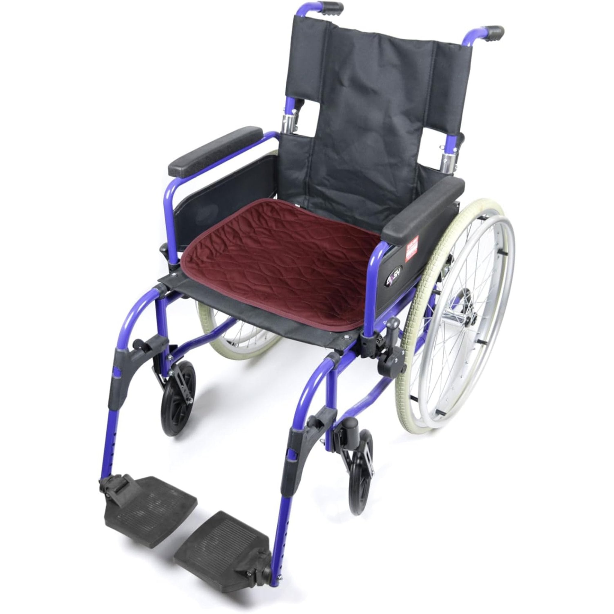 Designed with a quilted polyester top surface, the pad is soft and comfortable for extended use. Measuring 40 x 50cm, it fits neatly onto most wheelchairs, blending in discreetly to provide incontinence protection without drawing attention. Available in Maroon and Blue, the pad complements your wheelchair's aesthetic while offering peace of mind. -
