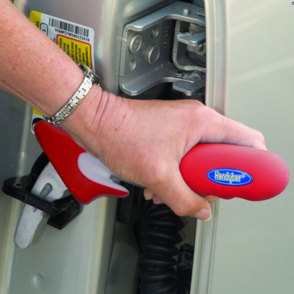 • The HandyBar has a no-slip ergonomic grip. It fits perpendicular to the car for a comfortable grip and optimal leverage.