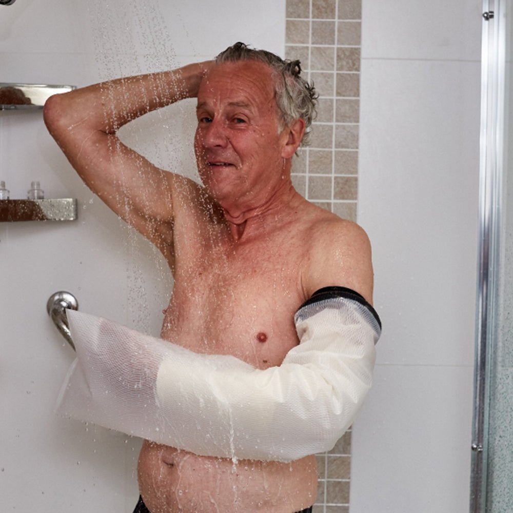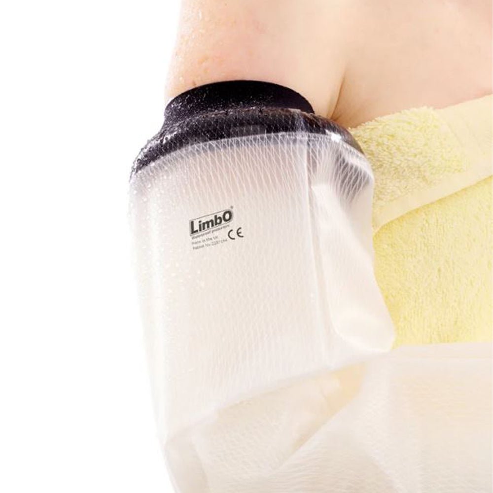 Waterproof protector for adults with casts or dressings covering the whole arm. This LimbO protector will seal just above the top of the cast and can be fully submerged.