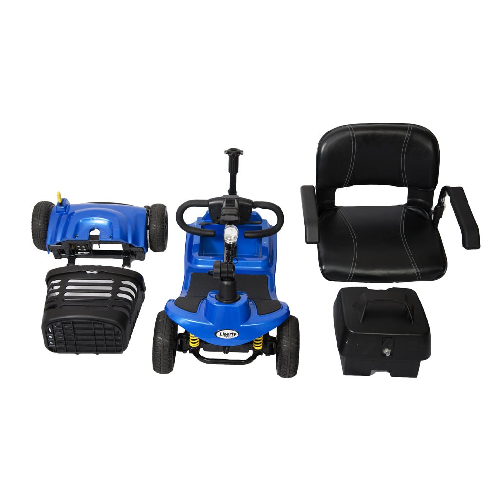 The Vogue is a wonderfully comfortable and fashionable scooter in our range with full adjustable suspension on the front and the back which provides a smoother, and more comfortable ride. The Vogue can be disassembled into five parts in just 30 seconds which aids with lifting and ensures a quick and safe lift into and out of your car. It also has great legroom for taller users giving a comfortable ride for all. Another detail is the secure-grip delta handlebar, which gives you full control over manoeuvring the scooter. The Vogue features an accessible battery pack which is simple to remove so you can move it to different charging locations. Also a second charging port is located in the tiller which allows for easy access when disassembling is not needed. The Vogue has an interchangeable battery pack which allows for a quick and cost-effective upgrade from 12Ah to 20Ah sized batteries, this ensures longer travel time and additional freedom. The scooter also has a powerful LED light, ideal for low light driving conditions.