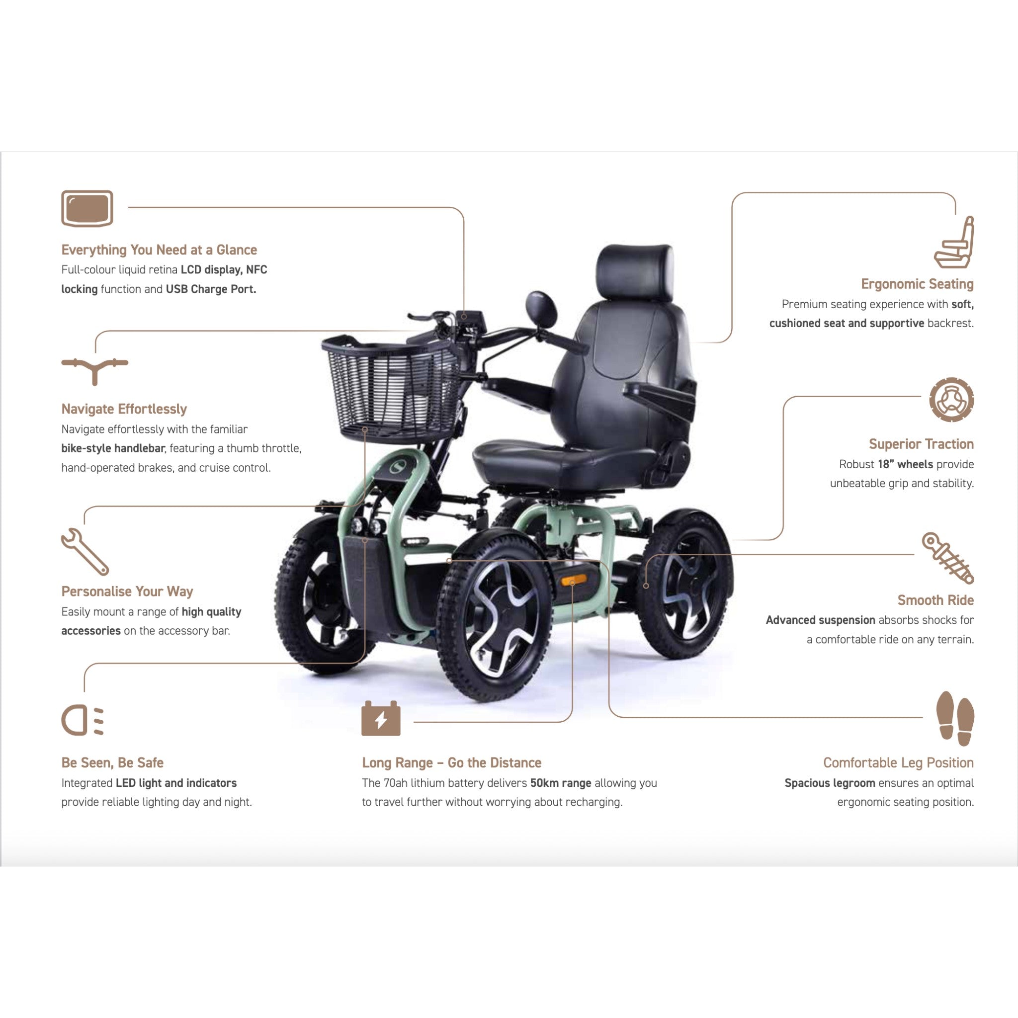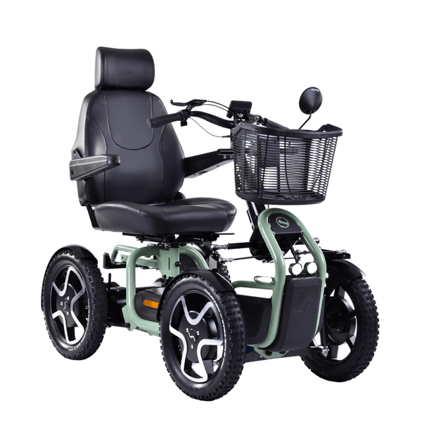 The Sterling S800 by Scoozy is a modern, innovative, and adventure-ready mobility solution, designed for those who refuse to compromise on freedom and performance. With its rugged four-wheel design, powerful lithium battery, and advanced suspension, this cutting-edge mobility scooter delivers a smooth, stable, and comfortable ride on any terrain—whether in the city or out on the trails.