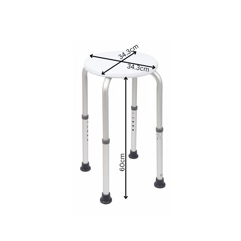 The moulded plastic seat is durable, easy to clean, and measures 34.3cm in both width and depth, offering a comfortable and stable surface for sitting. With a seat height of 51cm and an overall height of 60cm, the stool supports a natural, relaxed sitting posture while reducing strain during bathing.