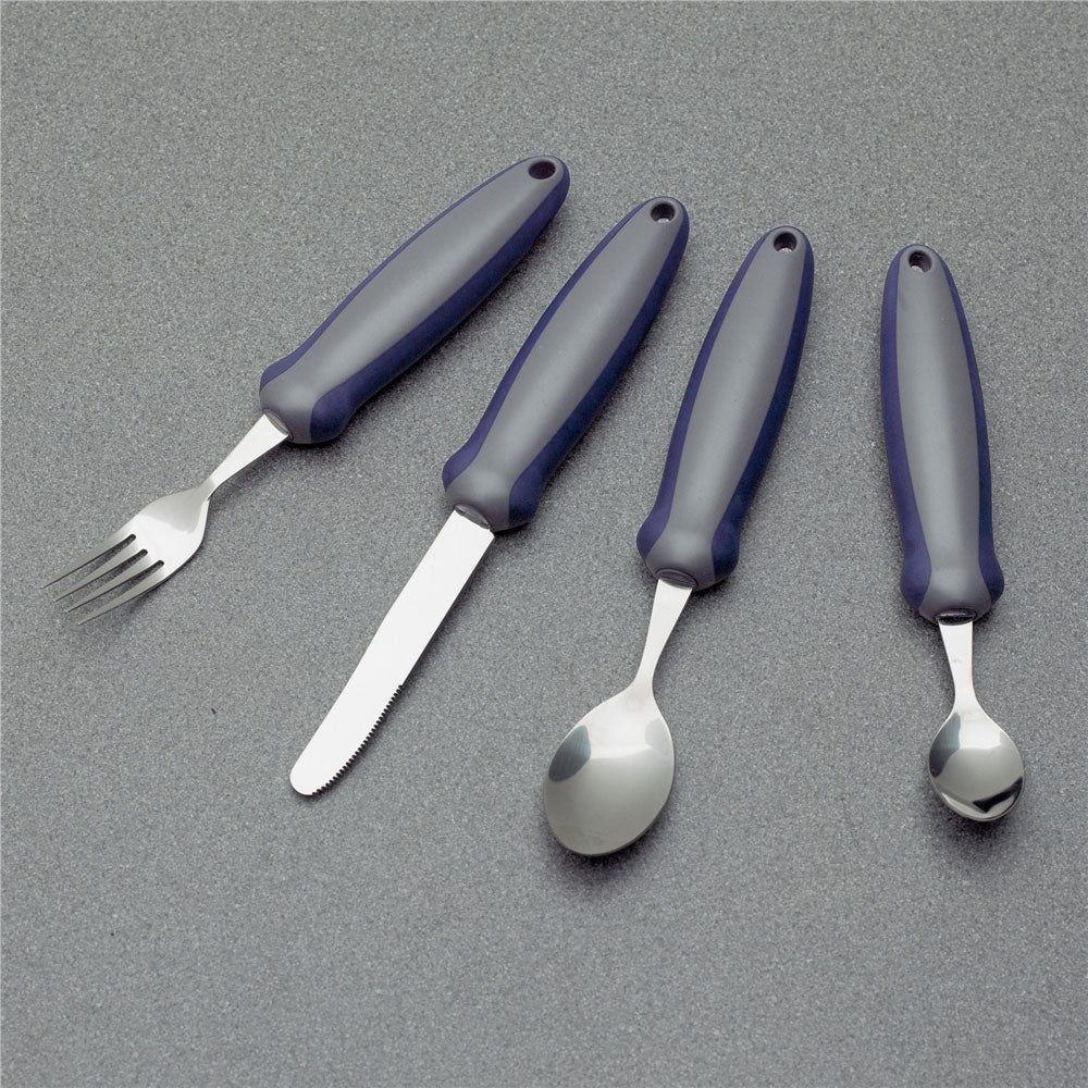 The Newstead Cutlery range has been ergonomically designed to give a soft, non-slip grip, the handles are cushioned to allow the user to hold the utensil firmly but comfortably, even when wet. The handles are made from tough plastic with a soft, flexible overmoulding allowing the handle to adapt to the user´s grip. All the utensils are made from stainless steel. The handle´s rounded shape allows it to fit naturally into the palm of a hand and is ideal for conditions such as Parkinson´s disease, neurological impairments, arthritis or any condition that can cause poor grip. The entire range is latex free and dishwasher safe. The standard Newstead Cutlery range is available to purchase either individually or as a retail packed set of four. The angled Newstead Cutlery range (Codes AA55205, AA55206, AA55207, AA55208, AA55209) is particularly suited for those with limited wrist or arm movement. Based on the standard Newstead Cutlery range. The knife can be used without cocking the wrist. The fork and spoon are available as right or left handed versions. The forks and spoons are set at 40° but may be bent to a more suitable angle. The weighted Newstead Cutlery range (Codes AA55210, AA55211, AA55212, AA55213, AA55214) feature a heavier handle that is particularly suitable for users who suffer from conditions such as hand tremors. The Weighted Cutlery is available to purchase either individually or as a set of four. The Splayed Fork (AA55215) and the Nelson Fork (AA55216) are designed for one handed eating. The Splayed Fork combines a spoon and fork into one handed utensil. It is a prolonged forkwith edges designed for cutting food and a deep rounded body which functions like a spoon. The Nelson Knife is a knife with cutting edge that ends as a curved prolonged fork, enabling food to be picked up.