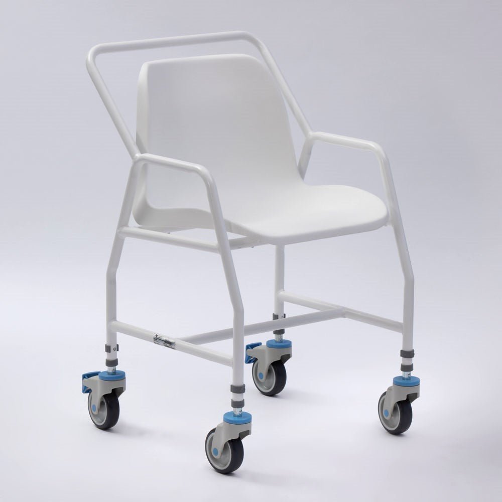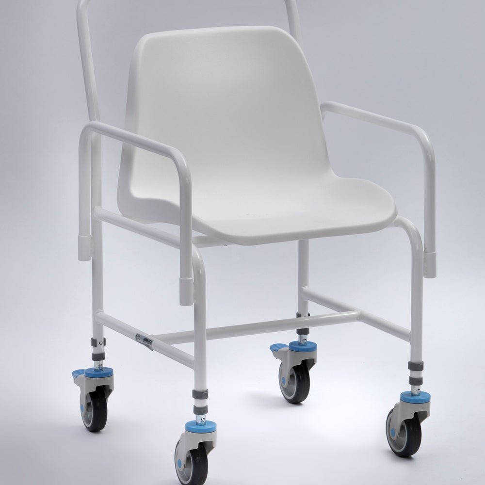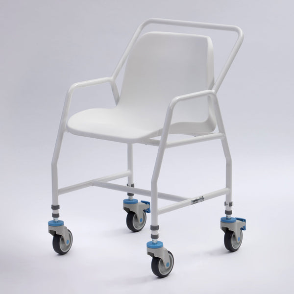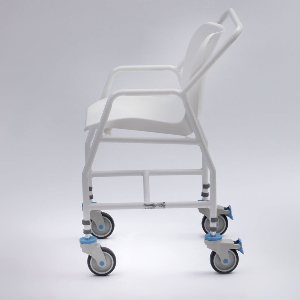 With a width of 53cm and a depth of 50cm, the Tilton Mobile Shower Chair provides ample space for users while maintaining a compact, manageable size. The width between the armrests is 48cm, offering comfortable support and ease of movement. Swivelling castors with brakes allow for safe positioning and easy manoeuvrability, while the brakes provide added security, preventing any unintended movement during use.