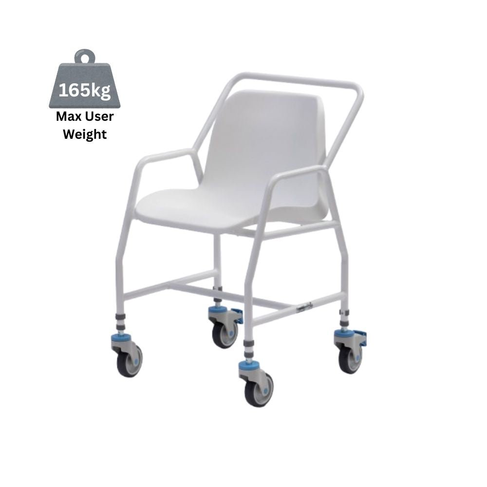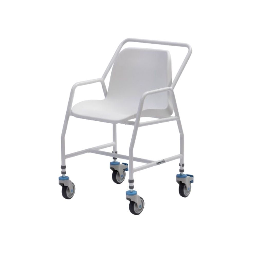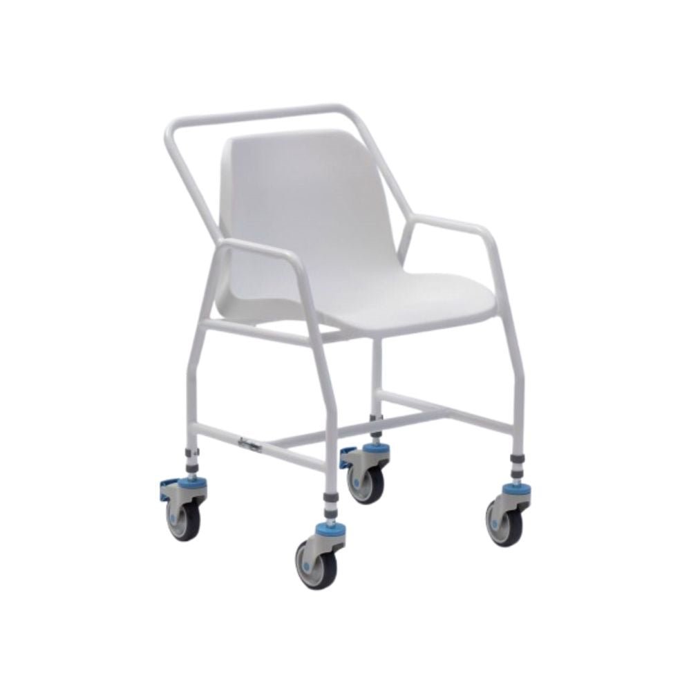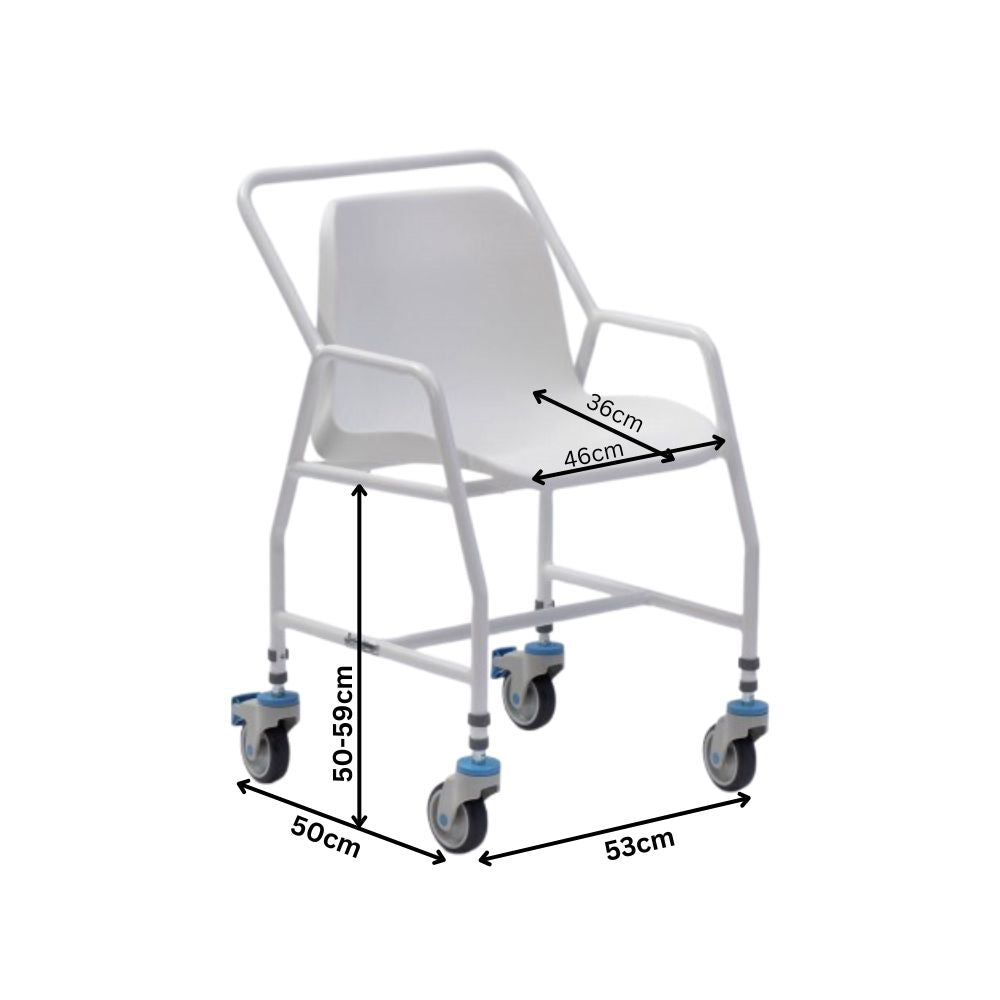 With a width of 53cm and a depth of 50cm, the Tilton Mobile Shower Chair provides ample space for users while maintaining a compact, manageable size. The width between the armrests is 48cm, offering comfortable support and ease of movement. Swivelling castors with brakes allow for safe positioning and easy manoeuvrability, while the brakes provide added security, preventing any unintended movement during use.