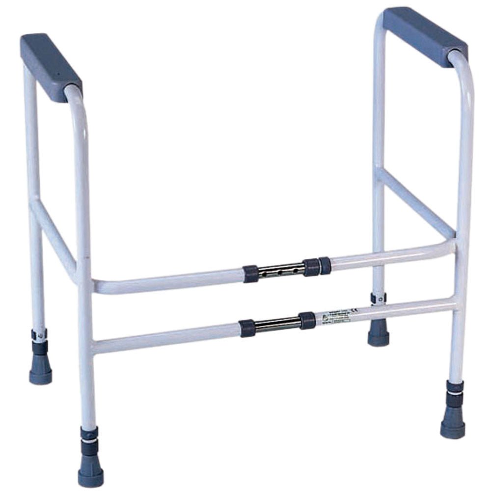 Free-standing, multi-adjustable frame surrounds toilet and provides supportive armrests to assist with getting on and off the toilet.